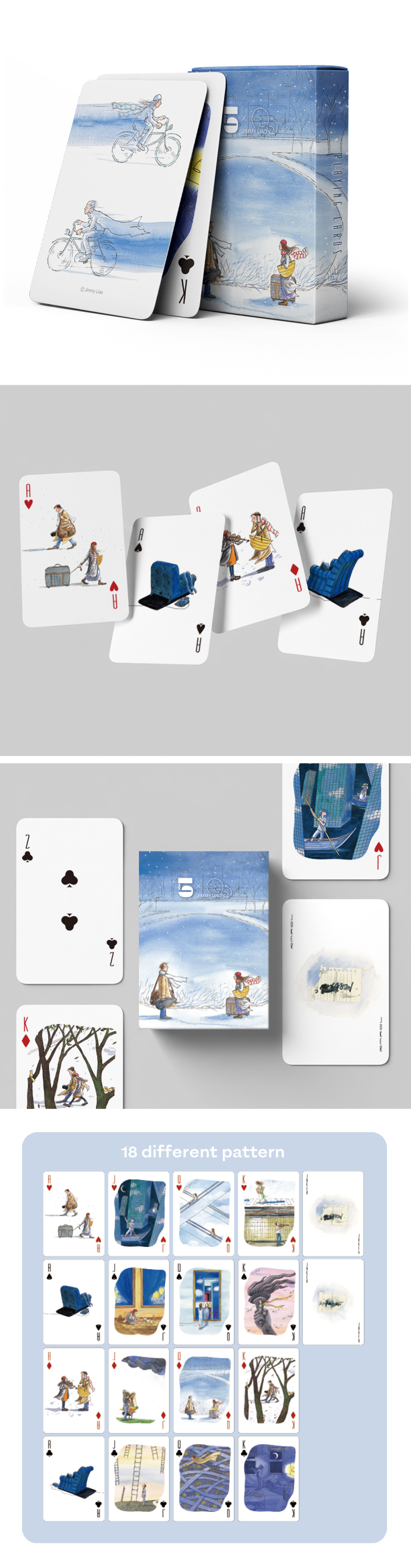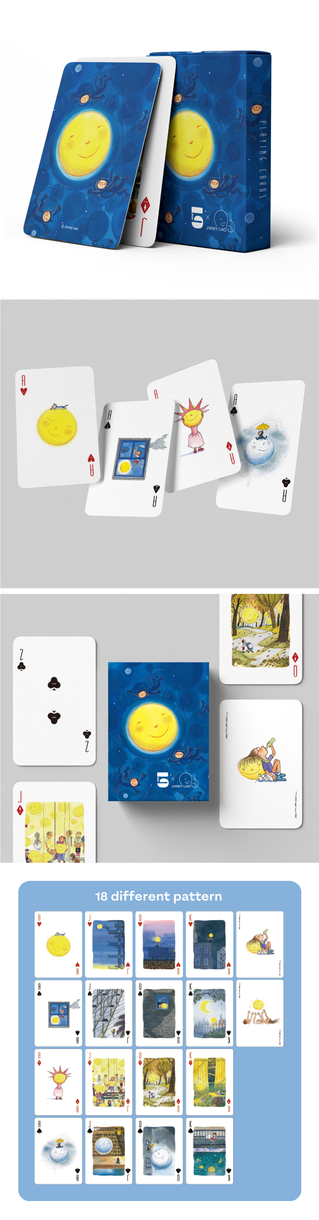 以幾米經典繪本《月亮忘記了》為主題,將溫柔童趣的繪本轉化為撲克牌設計。全副牌收錄18款不同圖樣,兼具遊戲實用性與收藏價值,適合送禮與日常使用。