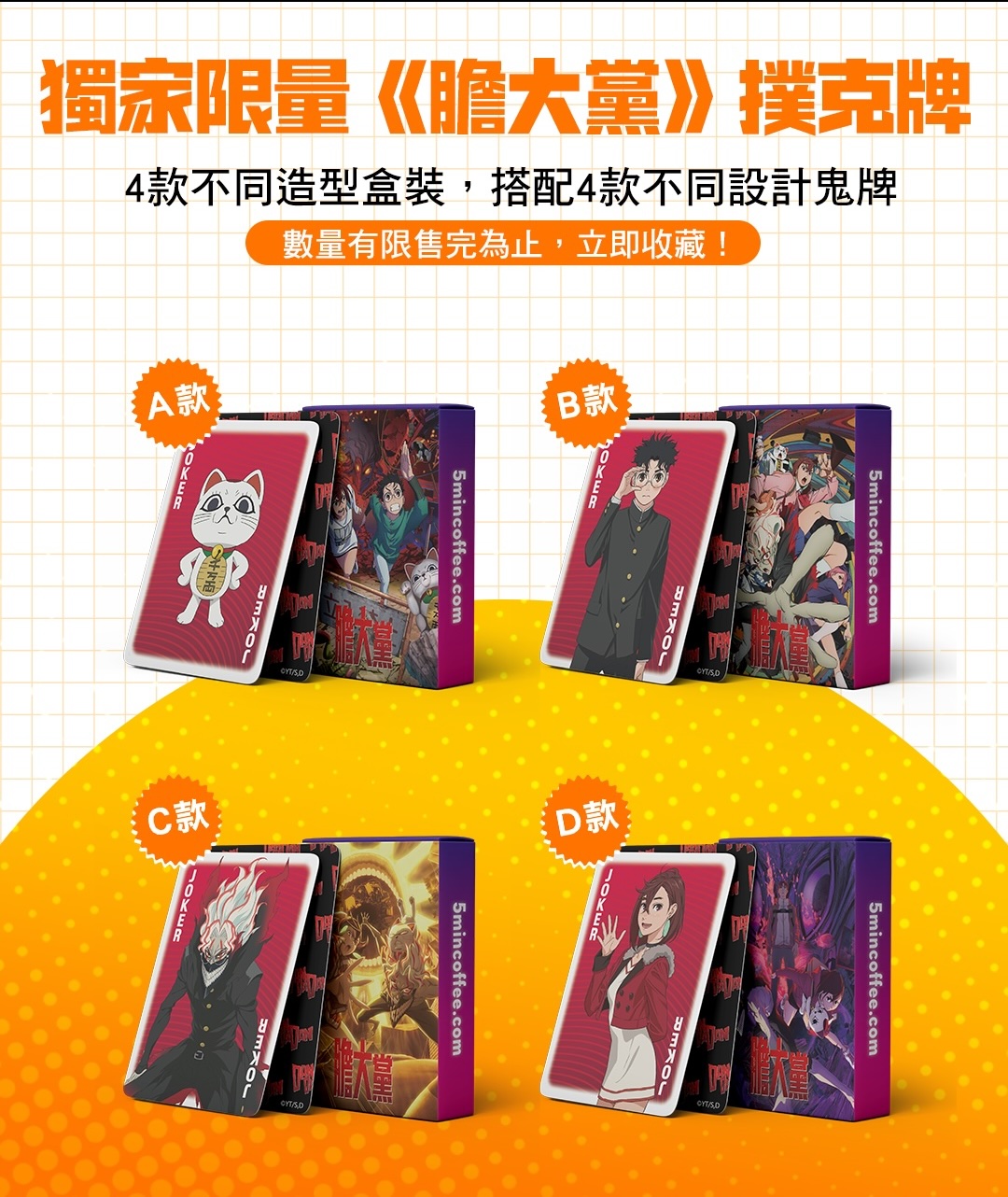 《獨家膽大黨撲克牌》共有4款不同外盒設計,搭配4款不同鬼牌設計。